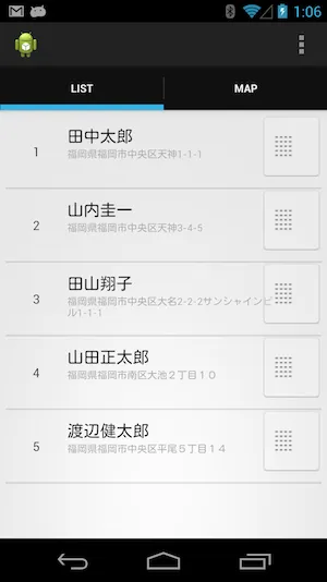 リスト画面が初期に表示され、まだインスタンス化されていないマップ画面が控えている。
