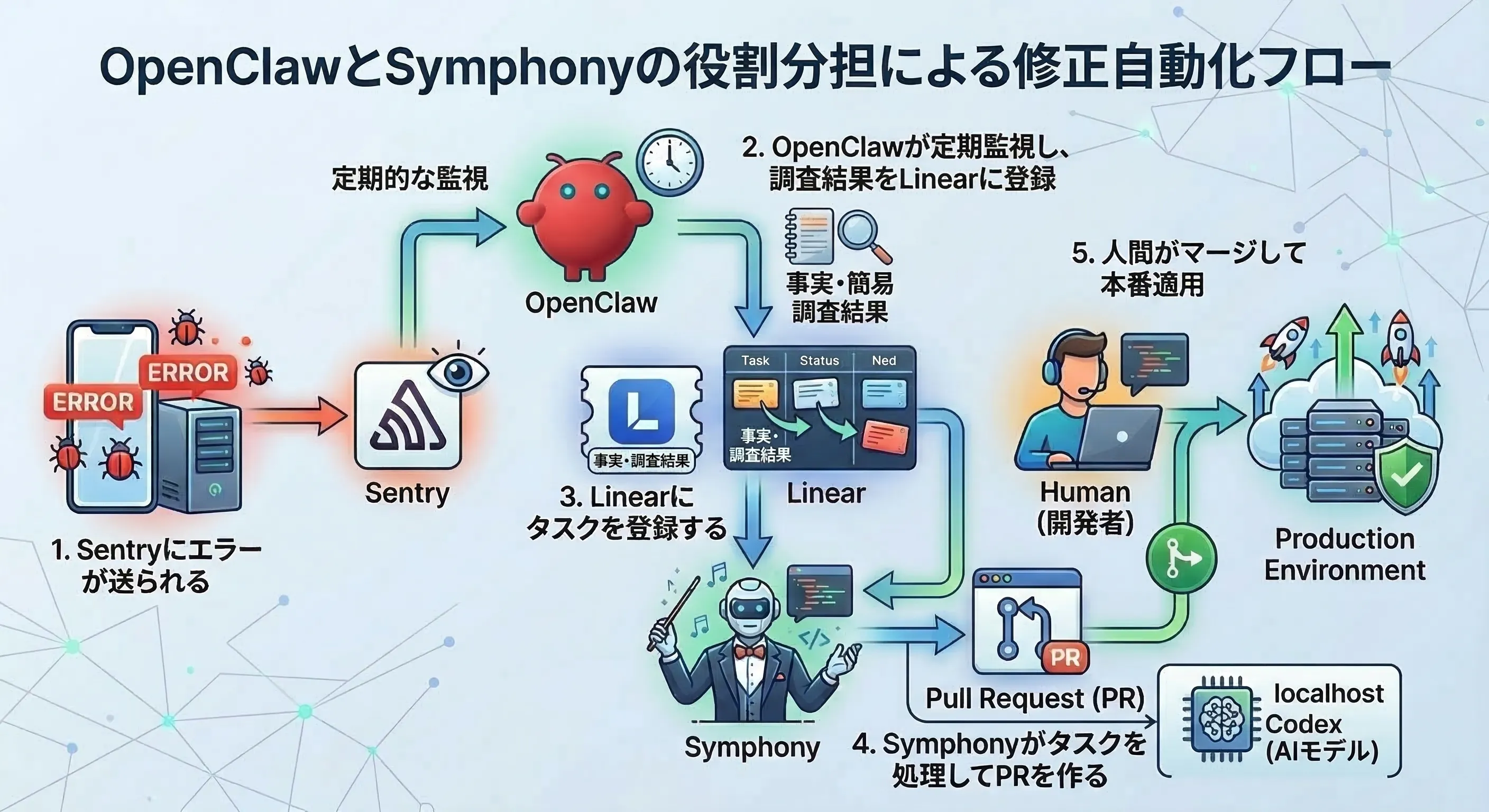 個人開発でOpenClawとSymphonyを使って、バグ修正や問題調査をAIに任せてます。あくまで個人開発の話なので、組織開発にそのまま使えるかは微妙なところ。