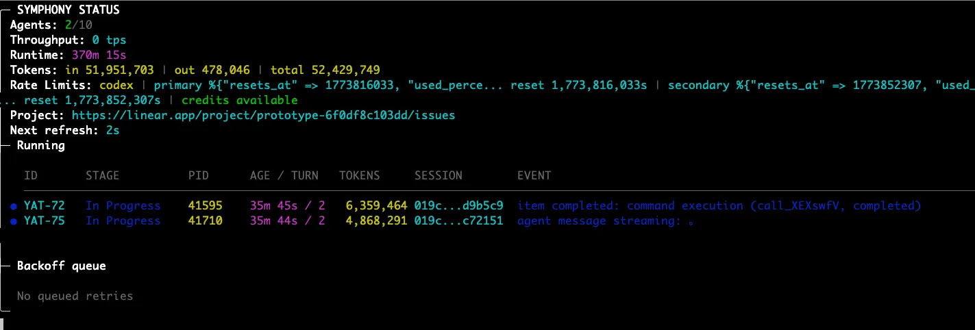 Symphonyで公開されているサンプル実装は、「Linearに登録されたタスクを検知してcodexが処理してPR作る」をやってくれるelixirのサービス。起動するとlocalでcodexを使ってLinearからタスクを引っ張ってきてひたすら実装してくれる。ちょっと前に流行ったVibeKanbanに似てる。