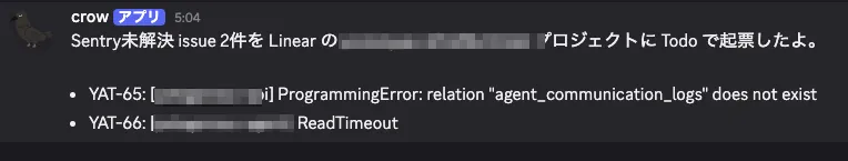 そこでOpenClawは事実まとめと簡易調査結果をLinearに登録するだけにして、実際の修正はSymphonyに任せることにした。 (Codex Web + Linearの直接連携でもたぶんいけるはず。)